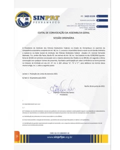 O SINPRF-PE convoca a todos os filiados para a Assembleia Geral Ordinária (AGO) que acontece no próximo dia 15 de junho, a partir das 8h30, na sede social de conformidade com o edital em anexo. Em pauta, prestação de contas Exercício 2021 e orçamento para 2023.